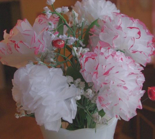 Craving some brights on my mantel but not wanting to spend much, if any, money, I checked out the craft supplies on hand and then using instructions I found here, I made white carnations from tissue paper and painted the edges of a few of them with a little red watercolor paint.