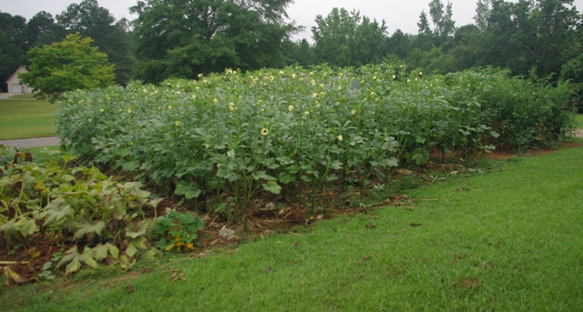 Bountiful has outdone herself! Who says great and mighty works can't come from small things? Not me. (Not especially since I am not quite 5 ' 2". But since I'm vertically challenged, I have a good excuse for not cutting the prickly, towering okra.)
